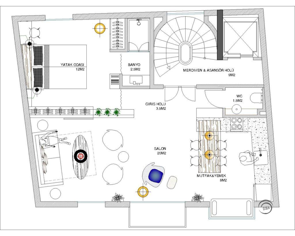 Detaylar: Galata/Beyoğlu bölgesinde yer alan tarihi eser bir yapıya komşuluk eden parsel için tasarlanan konut yapısının kütle ve cephesi, bölgenin tarihi doku ve kimliği ön planda tutularak bugünki çağdaş yapı malzeme ve teknolojileri kullanılarak tasarlanmıştır. Sınırlı alan içinde maksimum işlevsellikte yaşama alanları oluşturulması hedeflenen bu yapıda 3 adet loft daire (1+1), 1 adet çatı dublexi bulunmaktadır.
