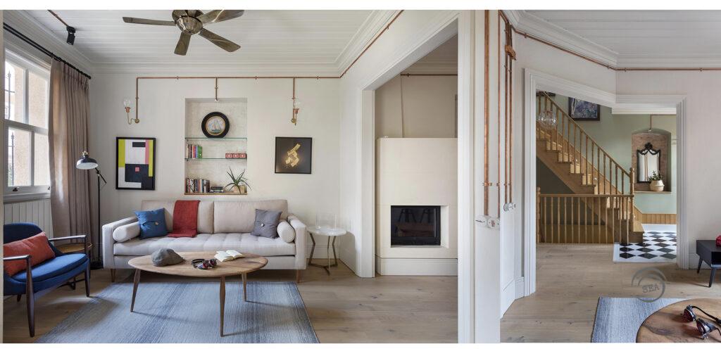 En alt katta ana mutfak ve yemek salonu, orta katta şömineli bir oturma ve yaşam alanı, buna ilave olarak küçük bir bar/ kitchenette tasarlandı. Çatı katı ise tamamen yaşayan kişilerin özel alanı olarak kurgulanarak, master yatak odası, giyinme odası ve salon salomanje mantığı ile ayrılan banyonun bir uzantısı olarak asma katıyla çocuk odası ya da kitap okuma köşesi olarak da kullanılabilecek bir lounge’tan oluşmaktadır.