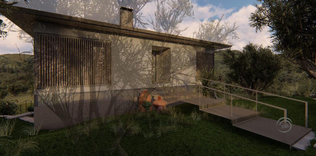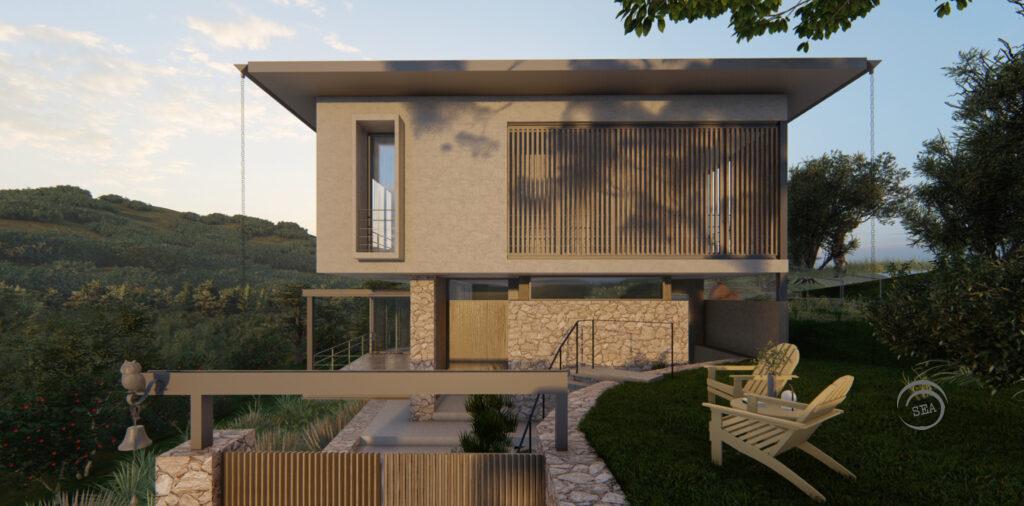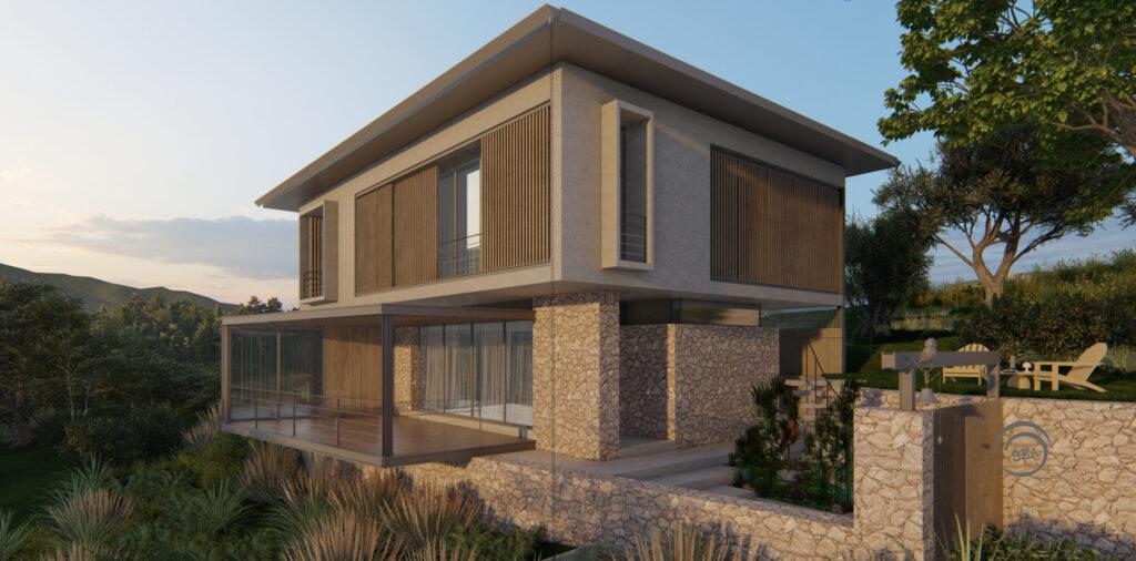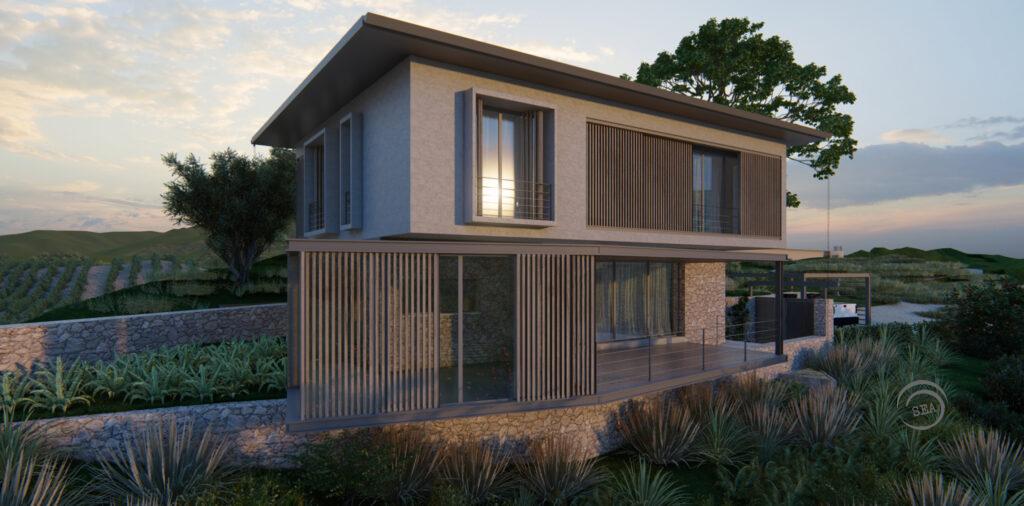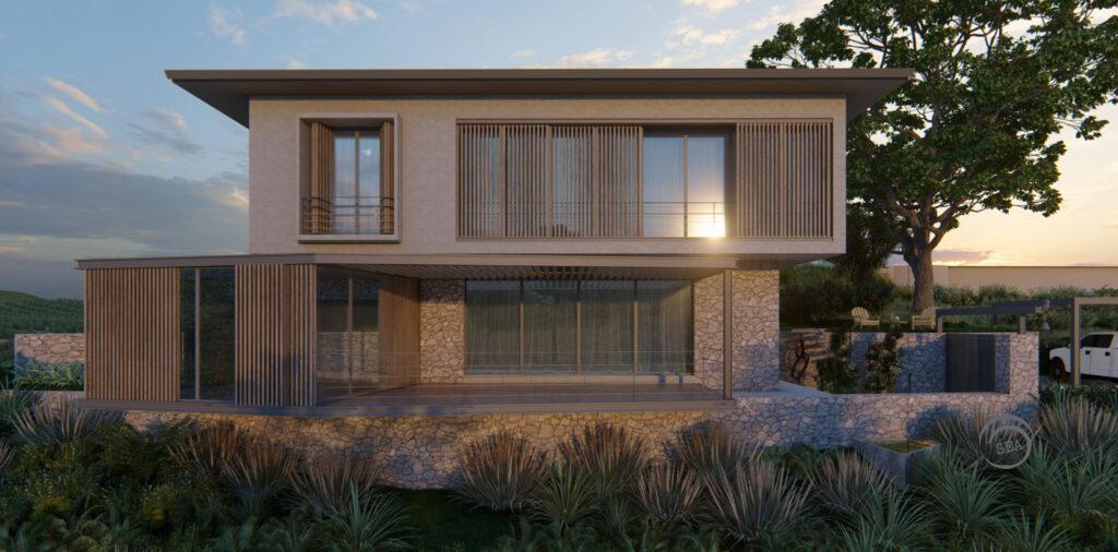 Detaylar: Antalya Olympos’ta yer alan olan bu iki katlı konut, doğal topoğrafyaya uyum sağlamak üzere, arazideki kot farkları dikkate alınarak tasarlanmıştır. Yüksek rakımlı konumu sayesinde etkileyici bir deniz manzarasına sahip olan yapı, doğayla bütünleşen malzeme tercihleriyle öne çıkmaktadır. Cephede kullanılmakta olan doğal taş, beton ve ahşap detaylar, yapıya zamansız bir estetik kazandırmaktadır. Ekolojik tasarım anlayışıyla geliştirilen projede enerji verimliliği ön planda tutulmakta; çatıda yer alan solar paneller sayesinde sürdürülebilir enerji üretimi sağlanmaktadır. Geniş cam yüzeyler, gün ışığını iç mekânlara maksimum düzeyde taşımakta ve doğal aydınlatmayı artırmaktadır. Bu modern ve çevreci yapı, Olympos Dağı’nın doğal güzellikleriyle uyum içinde, sakin ve huzurlu bir yaşam alanı sunmaktadır.