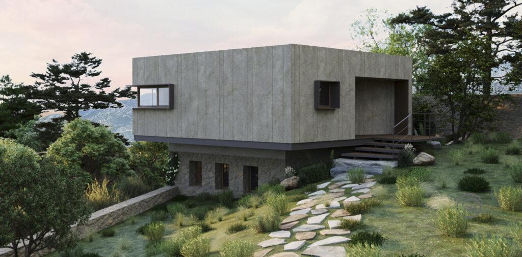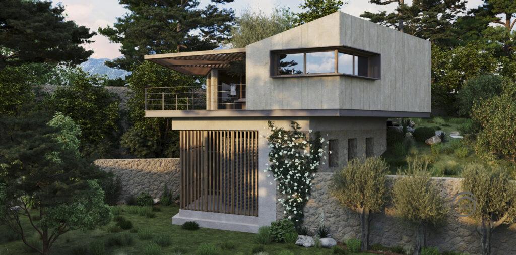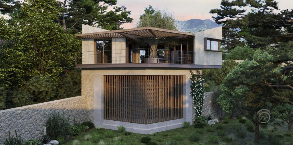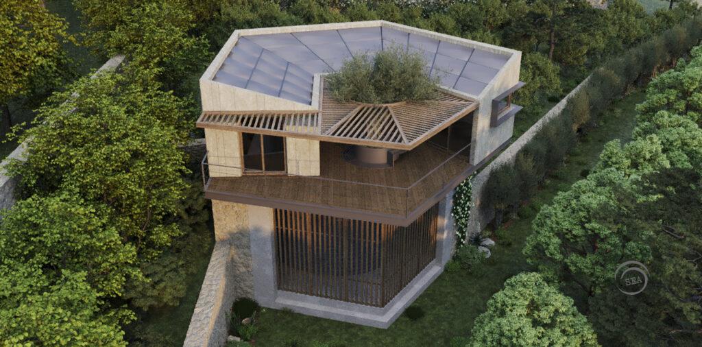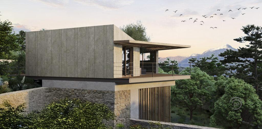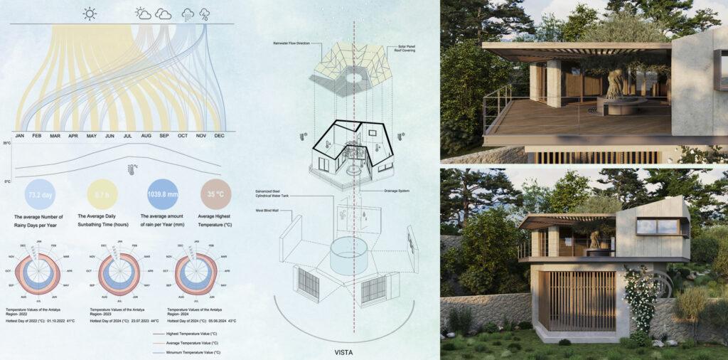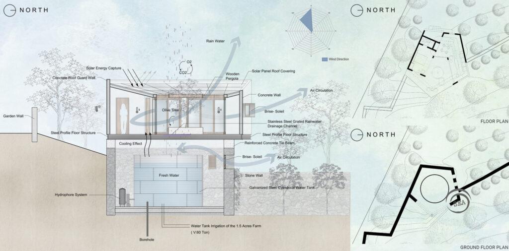 Tarım arazisi üzerine inşa edilen yapı, mevcut bir su kuyusunu hem yapının fiziksel strüktürüne hem de yaşam döngüsüne entegre eder. Yağmur suları toplanır, filtrelenir ve tekrar kuyuya döndürülerek su, toprak ve mimari arasında kesintisiz bir döngü oluşturulur. İklime duyarlı biçimde tasarlanan yapının batı cephesi güneşten korunmak için kapalı, doğu cephesi ise Akdeniz manzarasını çerçeveleyecek şekilde açıktır. Doğal havalandırma, kuyunun serin havasıyla desteklenerek pasif bir iklimlendirme sistemi yaratır.